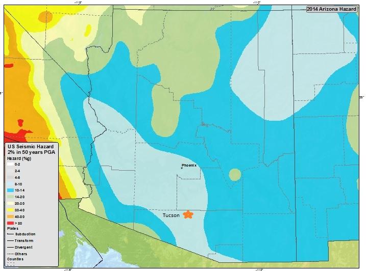 The 2014 Seismic Hazard Map – BELOW – Shows a very low probability of a seismic occurrence in Tucson, Arizona.