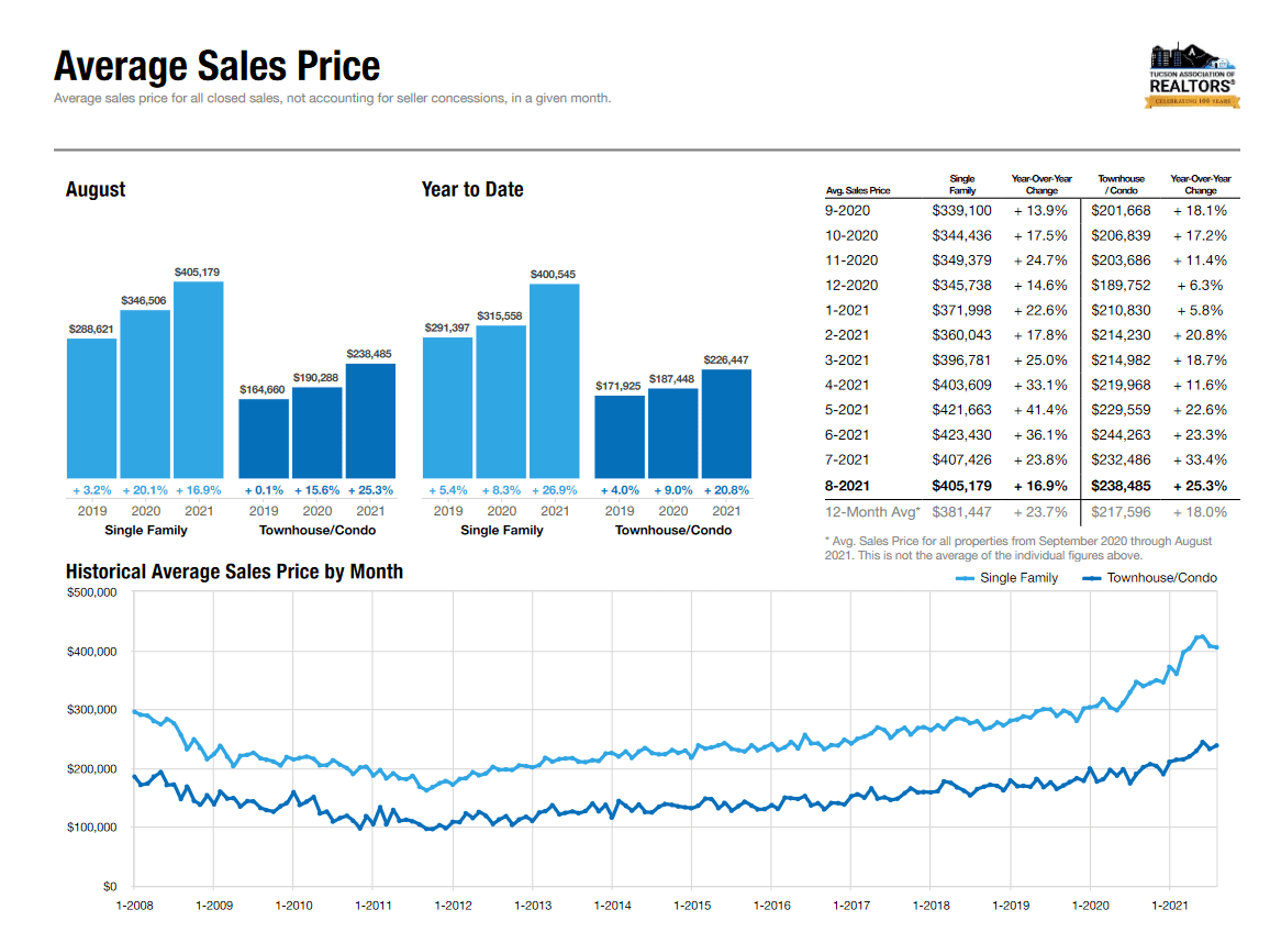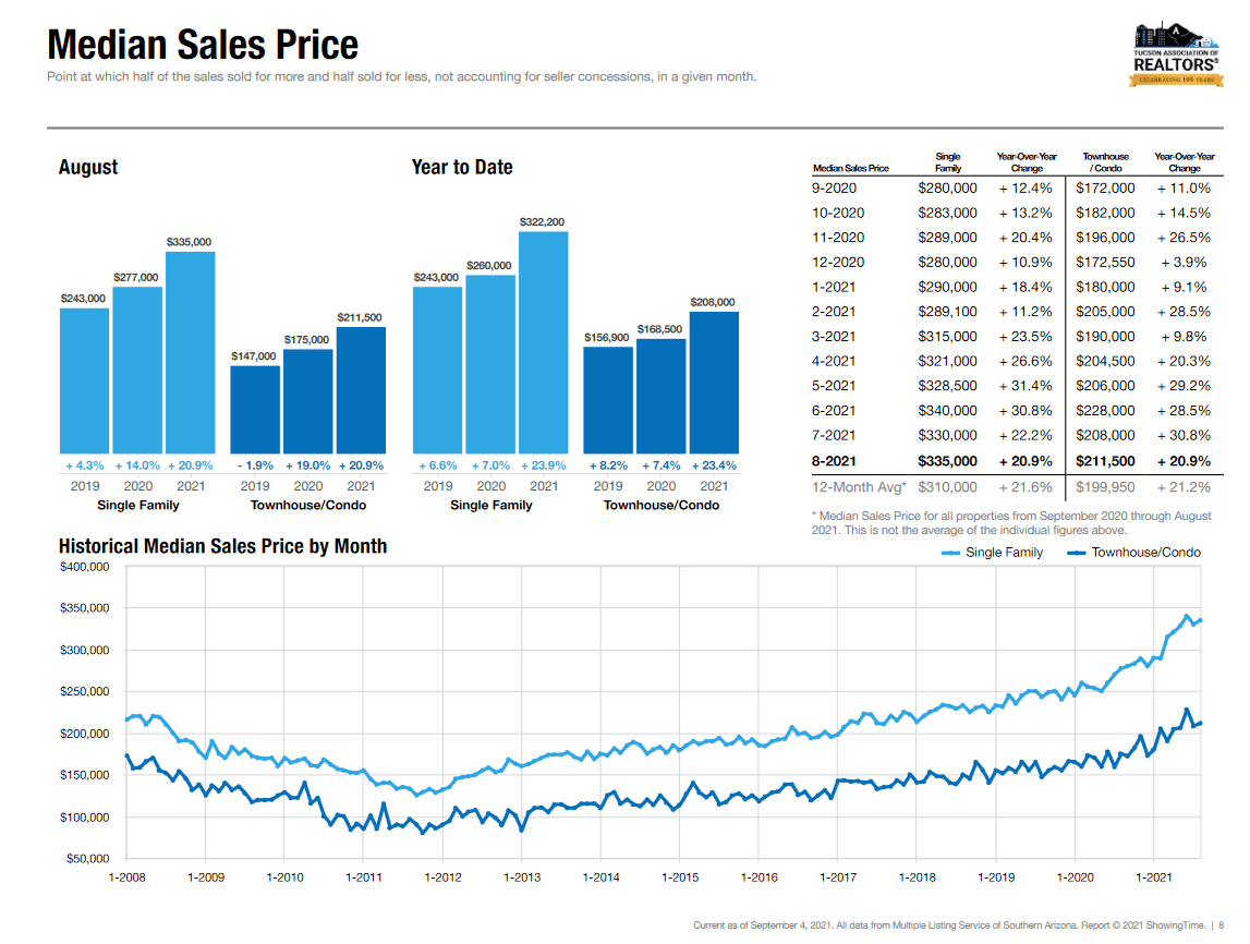Our Tucson Housing Market August 2021 Report shows the Average and Median Sales Prices for single family homes increased year over year – AGAIN – by 16.9% and 20.9%, respectively.