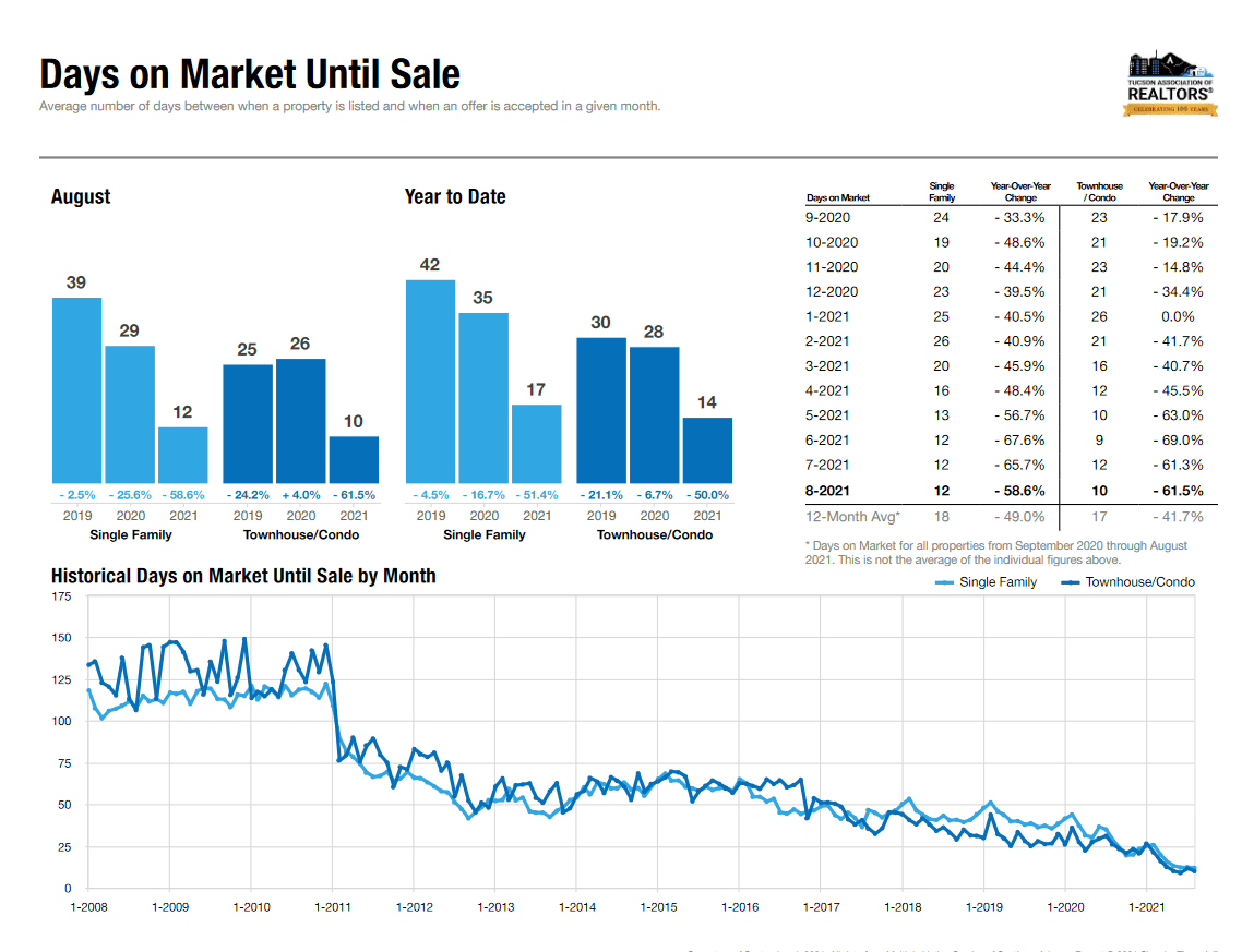 For Single Family Home Days On Market dropped 58.6% from August 2020, down – 17 days. For Condo/Townhouses DOM dropped 61.5% from the prior year period – down 16 Days.