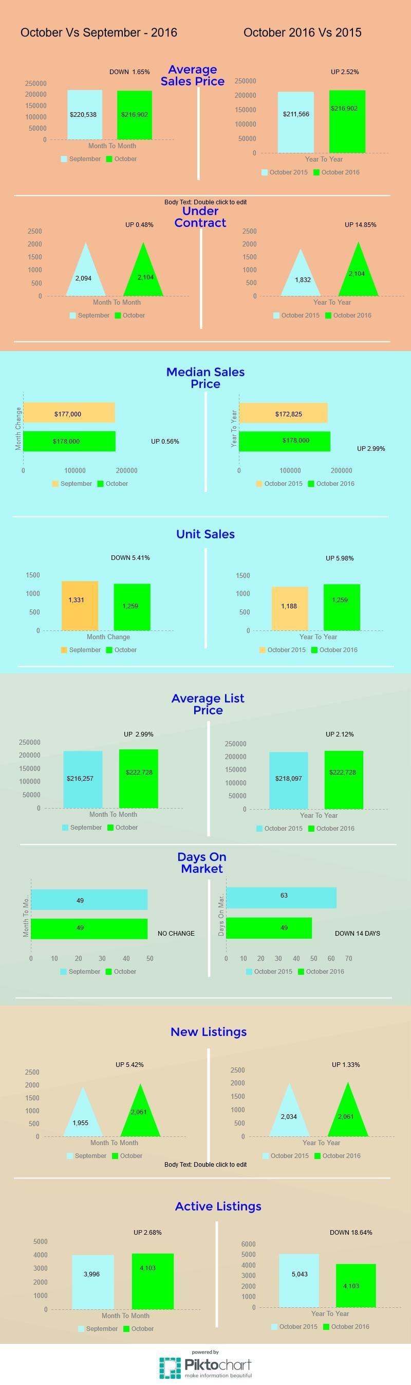 October Days On Market were FLAT staying at 49 days. Buyers pounced on well-priced homes that met their needs. Although active listings are low, average sales prices declined. Somewhat counter intuitive to economic theory. Or, an indication that buyers are waiting on the sidelines. Will the election results bring more buyers into the market? Perhaps November will reveal the answer.