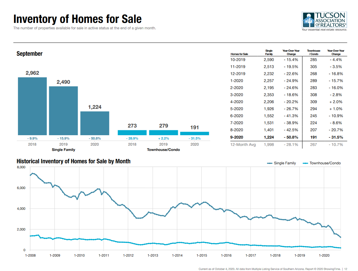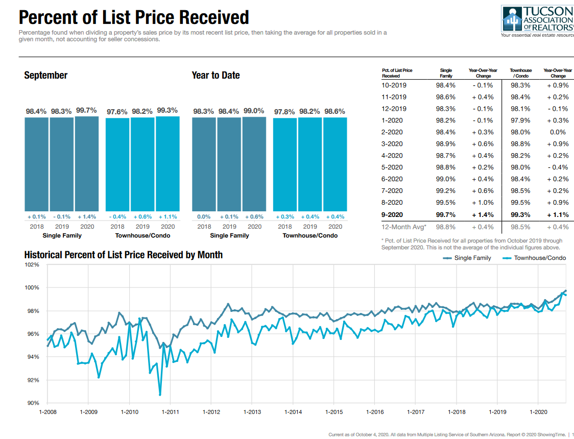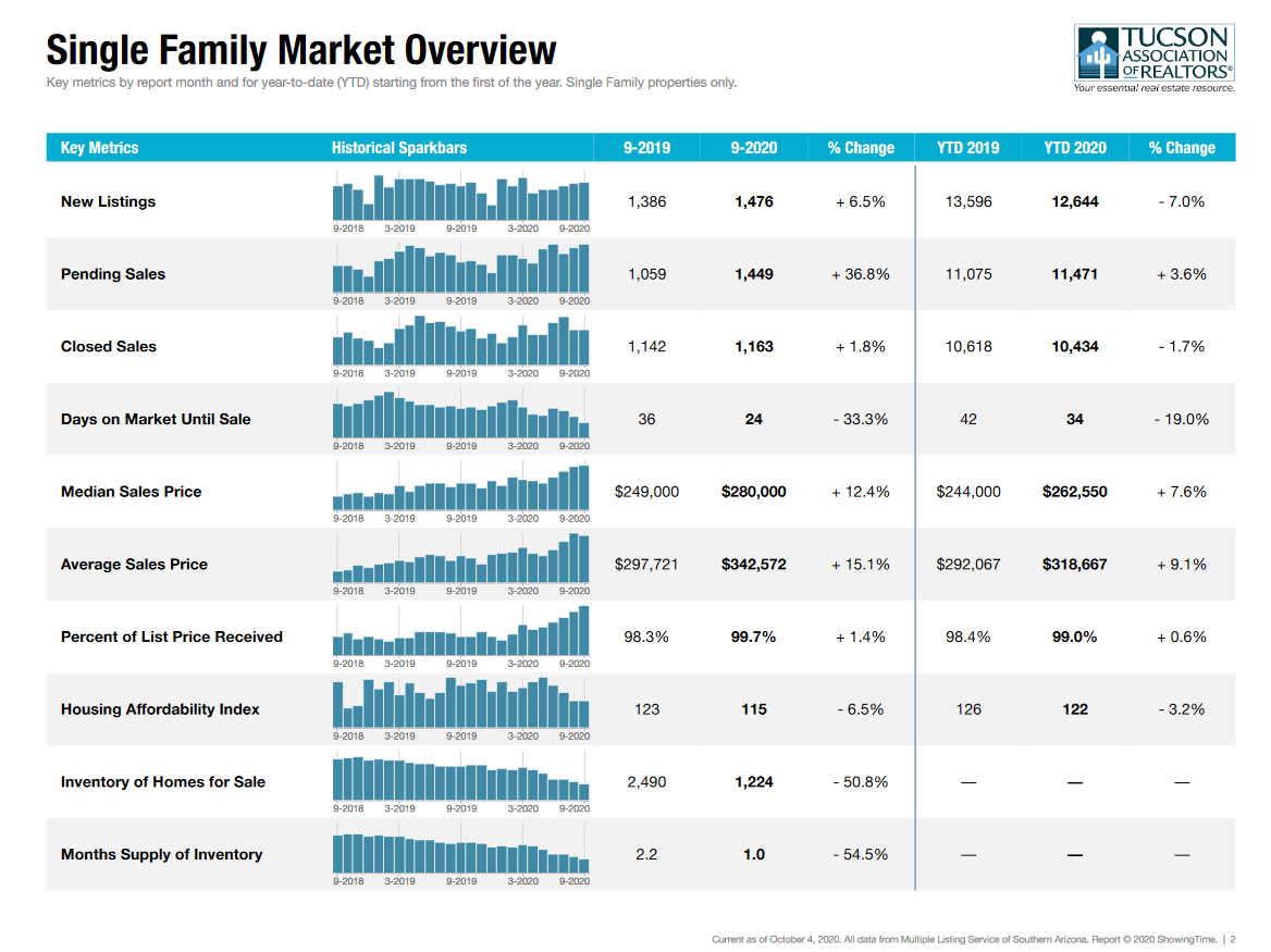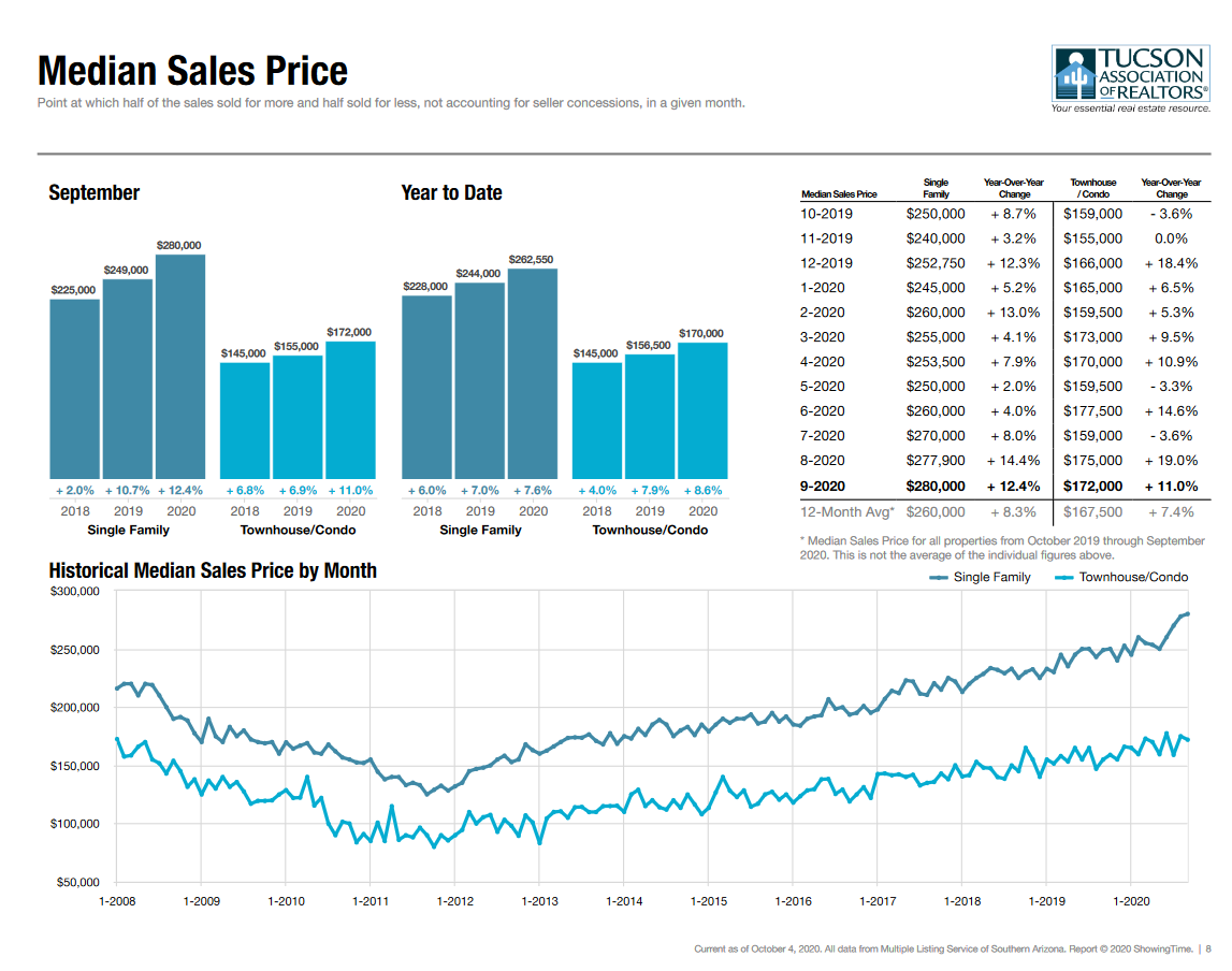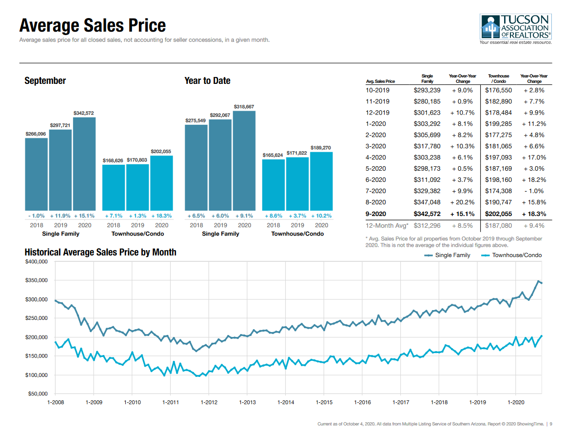 The Tucson Housing Market September 2020 report shows both the Average and Median Sales Prices for single family homes increased year over year, by 15.1% and 12.4% respectively.