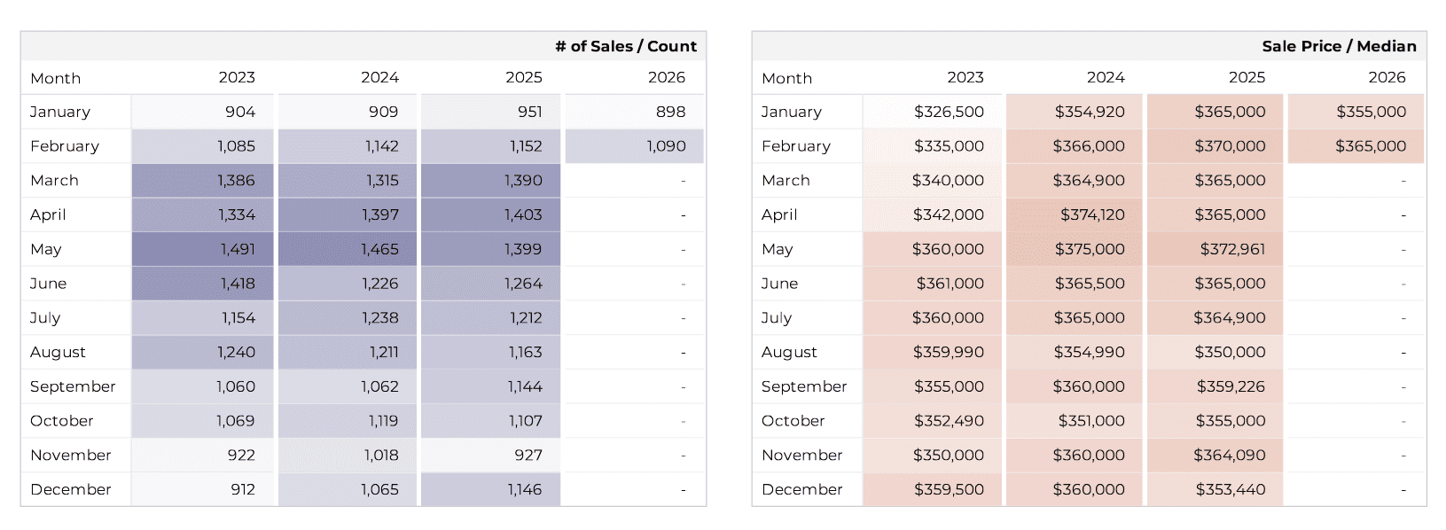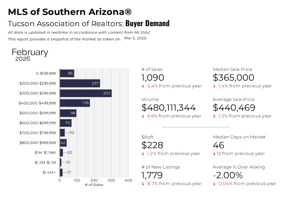 The Tucson Housing Market Pulse for February 2026, shows a 1.4% DECREASE in the Median sales price from February 2025 at $365,000. The Average sales price FELL 1.3% to $440,469.