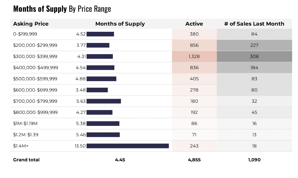 Homes in the $300,000 to $500,000 price range comprised 44.6% of the active listings at the end of February 2026. This price range has a 4.40 month’s supply of homes.