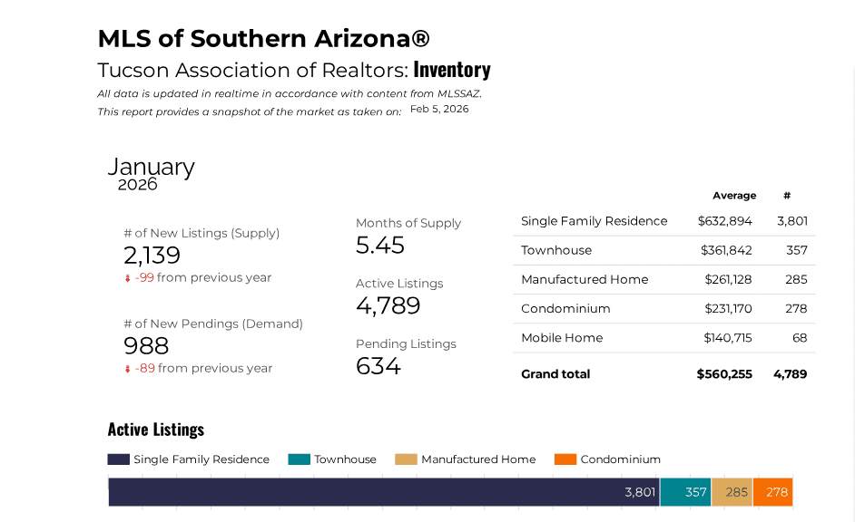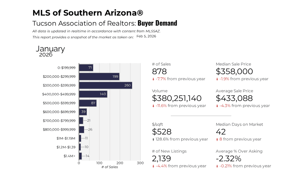 The Tucson Housing Market Pulse for January 2026, shows a 1.9% DECREASE in the Median sales price from January 2025 at $358.000. The Average sales price FELL 4.3% to $433,088.