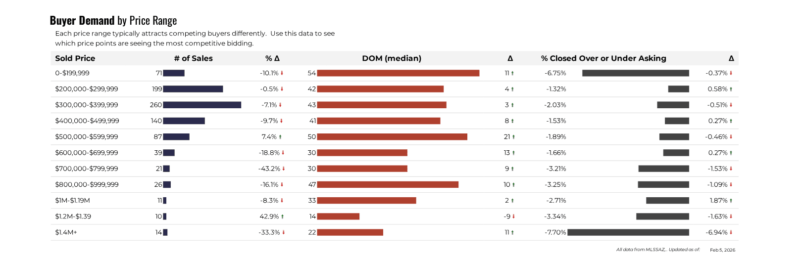 | The Tucson housing market for January 2026 shows home sales at the lowest sales level in 3 years. Median price declined 1.9% and the Average price dropped 4.3%. The outlook for sellers is a slowing market with modest price declines. Buyers will have more inventory to choose from and greater negotiating power. Homes that are well priced and updated will be competitive. |