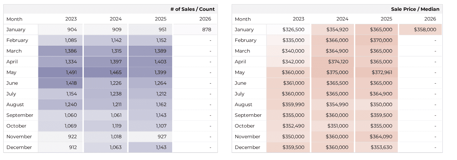 November’s new listings stand at 2,139 DOWN 4.4% from the prior year and total Active listings stand at 4,789. Active Listings of Single-Family homes stand at 3,801 at the end of January 2026 at an Average Price of $632,894.