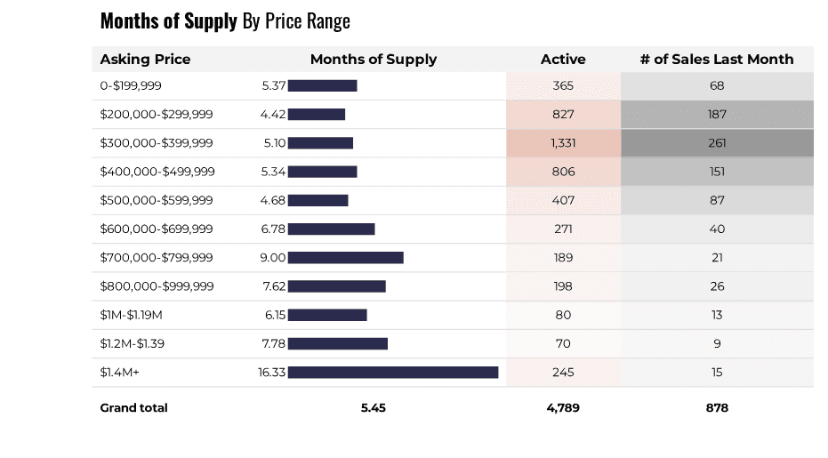 Homes in the $300,000 to $500,000 price range comprised 44.6% of the active listings at the end of January 2026. This price range has a 5.19 month’s supply of homes.