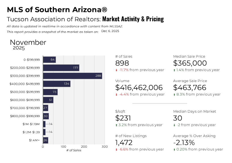 The Tucson Housing Market Pulse for November 2025, shows a 1.4% INCREASE in the Median sales price from November 2024 and 2.8% from prior month. The median sales price is $365,000. The Average sales price INCREASED 8.3% to $463,766.