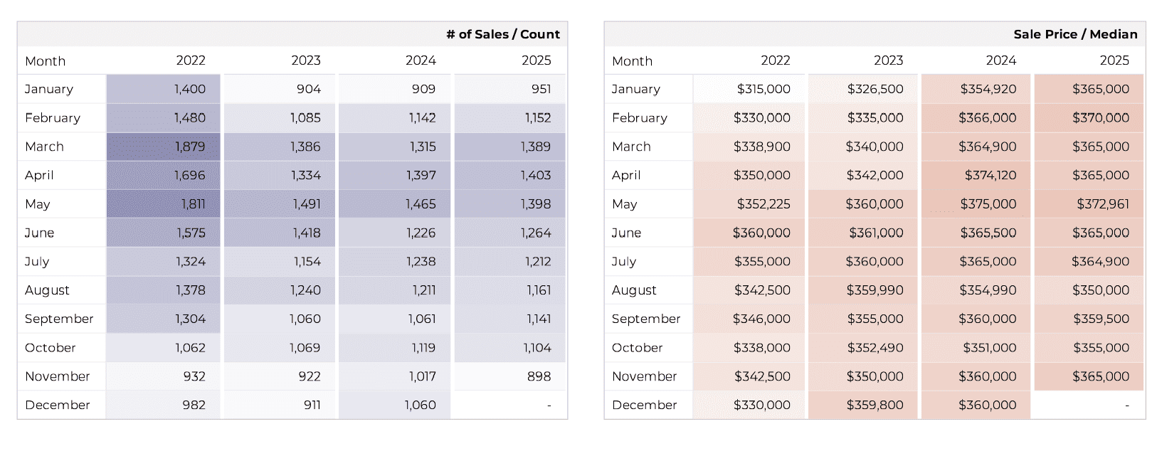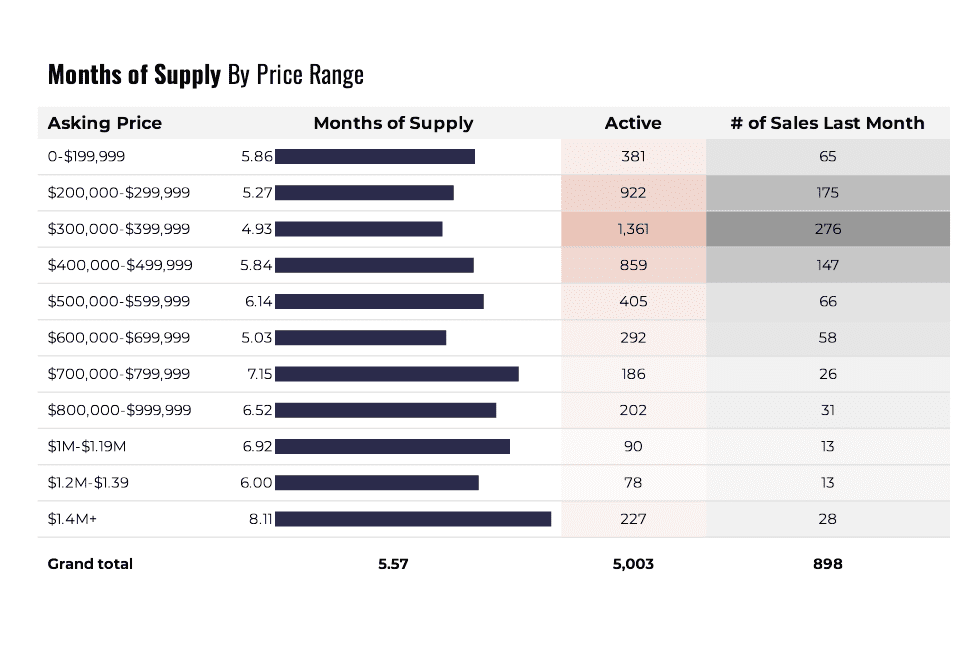 Homes in the $300,000 to $500,000 price range comprised 44.3% of the active listings at the end of November 2025. This price range has a 5.28 month’s supply of homes.