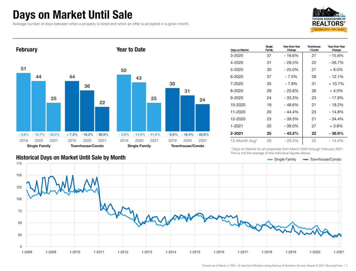 For Single Family Home Days On Market dropped 43.2% from February 2020, down – 19 days. For Condo/Townhouses DOM dropped 38.9%% from the prior year period – down 18 Days.